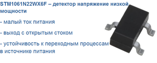 Детектор напряжения малой мощности STM1061N22WX6F от компании STMicroelectronics осуществляет контроль напряжения батареи источника питания и обеспечивает номинальный уровень напряжения питания в системе. Прецизионный эталонный источник напряжения и компаратор отслеживают входное напряжение VCC и сравнивают его с заданным пороговым значением. Когда VCC падает ниже...