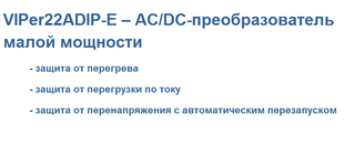 Микросхемы VIPer22ADIP-E содержат на одном кристалле ШИМ-контроллер и высоковольтный МДП-транзистор, а также встроенную схему защиты от перегрева и перегрузки по току, что позволяет значительно повысить надежность источников питания, построенных с использованием VIPer22ADIP-E. Область применения микросхем VIPer22ADIP-E – всевозможные источники питания мощностью до...