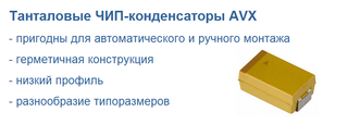 Танталовые ЧИП-конденсаторы бренда AVX пригодны как для автоматического, так и для ручного монтажа. Герметичная конструкция обеспечивает защиту от воздействия влаги, допускает промывку платы после монтажа. На маркировке указываются номинальная емкость, рабочее напряжение, черная полоса со стороны положительного вывода. Конденсаторы поставляются в катушках диаметром 180...
