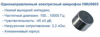 Электретный микрофон серии HMU0603 , производства компании JL World, представляют собой разновидность конденсаторного микрофона, использующего в качестве одной обкладки пластину из электрета, способного сохранять поверхностный заряд в течение длительного времени. Кроме однонаправленности, микрофоны отличаются высокой чувствительностью -45 дБ, широким диапазоном частот...
