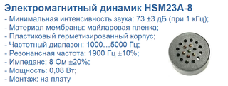Компактный динамик HSM23A-8 , производства тайваньской компании JL World , представляет собой электромагнитный излучатель звука, выполненный с мембраной из майларовой пленки. При номинальной мощности всего 0,08 Вт и сопротивлении катушки 8 Ом, динамик способен развивать звуковое давление 73 дБ. При резонансной частоте 1900 Гц, его частотный диапазон простирается от 1000...