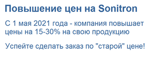 Компания Sonitron анонсировала повышение цен на свою продукцию на 15-30%. С мая текущего года товары будут отгружаются по новым ценам. "Спецэлсервис" не повышает цены на складские остатки - товары со склада вы можете приобрести по старым ценам.
