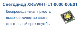 Светодиод XREWHT-L1-0000-00E01 от компании Cree Inc. принадлежит к семейству XLamp® XR-E. Это семейство характеризуется беспрецедентной яркостью, эффективностью, длительным сроком службы и качеством света, благодаря чему светодиоды семейства XLamp® XR-E могут заменит многие традиционные источники освещения.
