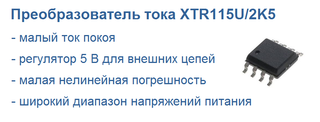 XTR115U/2K5 – это прецизионные преобразователи выходного тока, предназначенные для передачи аналоговых сигналов от 4 до 20 мА по стандартному токовому контуру. Они обеспечивают точное масштабирование тока и имеют функцию ограничения выходного тока. Встроенный регулятор напряжения (5 В) может использоваться для питания внешних схем. Прецизионный встроенный генератор...
