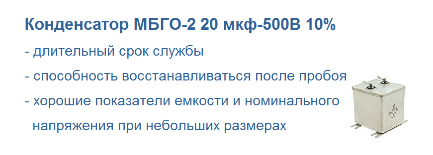 Преимуществами конденсаторов МБГО-2 являются отличные показатели емкости и номинального напряжения при небольших размерах, большой срок службы и способность восстанавливаться после пробоя.