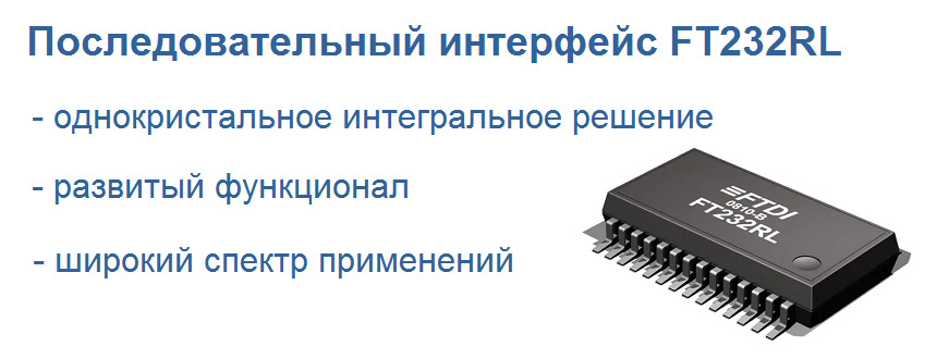 Микросхема FT232RL представляет собой универсальный асинхронный приемопередатчик (UART) и является высокоинтегрированным последовательным интерфейсом USB-COM.