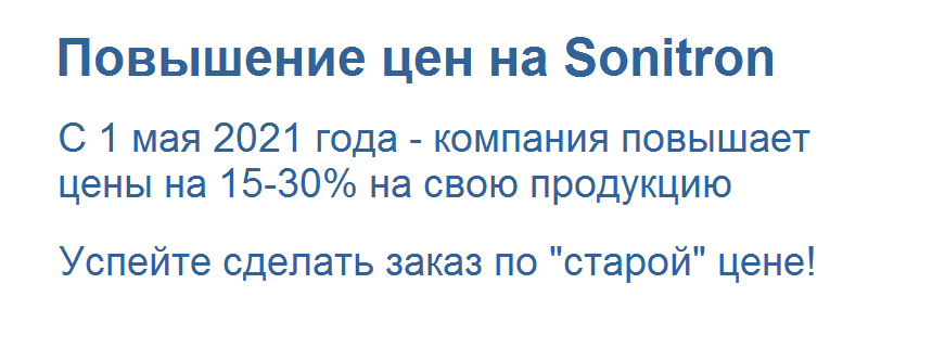 Компания Sonitron анонсировала повышение цен на свою продукцию на 15-30%. С мая текущего года товары будут отгружаются по новым ценам.