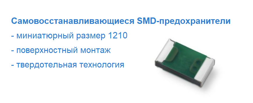 Кроме того, самовосстанавливающиеся предохранители практически незаменимы в необслуживаемых устройствах, где имеют место многократные токовые перегрузки, а замена сработавших плавких предохранителей невозможна. На сегодняшний день к областям применения самовосстанавливающиеся предохранителей относятся также общая, автомобильная, медицинская электроника, батарейная носимая техника, любые устройства, где требуется высокая плотность монтажа.