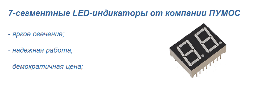Светодиодные 7-сегментные индикаторы (символьные LED дисплеи) предназначены для отображения информации в цифровом виде в различных электронных устройствах. По сравнению с жидкокристаллическими индикаторами, светодиодные индикаторы намного ярче, контрастнее и потому легче воспринимаются человеческим зрением. Индикаторы могут управляться специальными дешифраторами, или непосредственно микроконтроллером. Символы на индикаторе состоят из семи светодиодных элементов, расположенных на плоскости дисплея в виде цифры 8. Дешифратор или микроконтроллер подает напряжение на нужную комбинацию сегментов, в результате чего загораются определенные символы. Как правило, это цифры, но при необходимости могут отображаться буквы и другие символы.