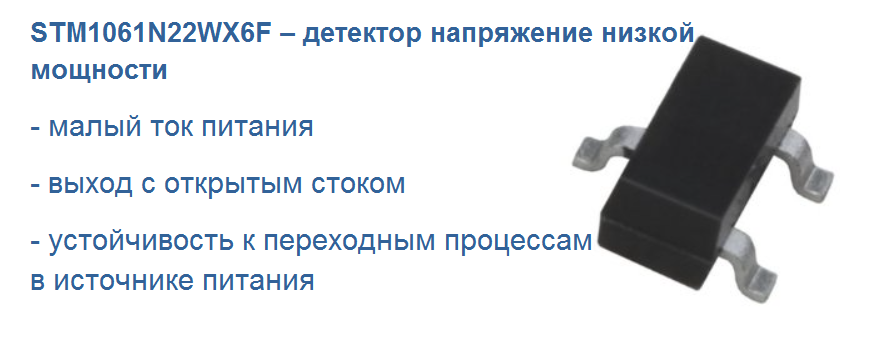 Детектор напряжения малой мощности STM1061N22WX6F от компании STMicroelectronics осуществляет контроль напряжения батареи источника питания и обеспечивает номинальный уровень напряжения питания в системе. Прецизионный эталонный источник напряжения и компаратор отслеживают входное напряжение VCC и сравнивают его с заданным пороговым значением. Когда VCC падает ниже заданной величины, выходное напряжение принудительно снижается и остается низким до тех пор, пока VCC не превысит уровень 0,7 В (учитывается гистерезис). STM1061N22WX6F также предназначено для нивелирования быстрых переходных процессов в источнике питания. Детектор STM1061N22WX6F низким энергопотреблением идеально подходит для портативных устройств.