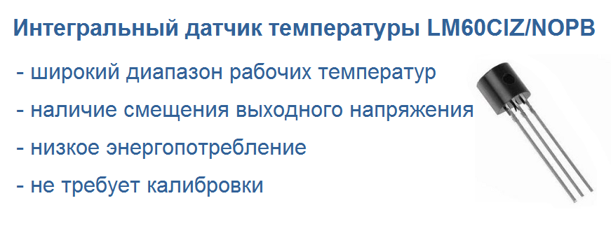 Устройство LM60CIZ/NOPB представляет собой прецизионный интегральный датчик температуры, который может измерять температуру в диапазоне -40...+125 °C, при работе от источника питания 2,7 В. Выходное напряжение прибора линейно пропорционально температуре с коэффициентом 6,25 мВ/°С, и имеет смещение 424 мВ. Смещение позволяет считывать отрицательные температуры без применения в "минусового" источника питания.