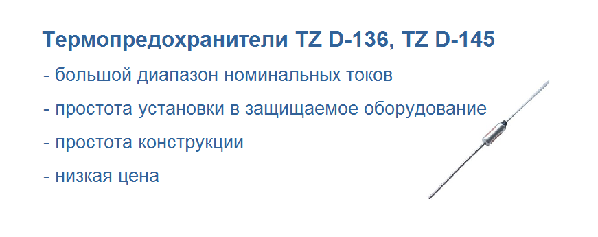 Термопредохранители TZ D-136 и TZ D-145 предназначены для защиты от перегрева и выхода из строя различного оборудования и компонентов, таких как мощные транзисторы, трансформаторы, электродвигатели и т.д. В отличие от обычных предохранителей, которые срабатывают при превышении заданного тока, термопредохранители срабатывают при превышении заданной температуры.
