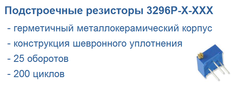 Подстроечные резисторы 3296Р выполнены в металлокерамическом корпусе, габаритные размеры которого составляют 9,53×11,55×4,83 мм. Резисторы 3296Р применяются в широком спектре устройств. Число оборотов подстроечного винта составляет 25. Мощность резисторов – 0,5 Вт, максимальное рабочее напряжение – 300 В, количество циклов регулировки – 200, точность – 20%, тип монтажа – в отверстия.
