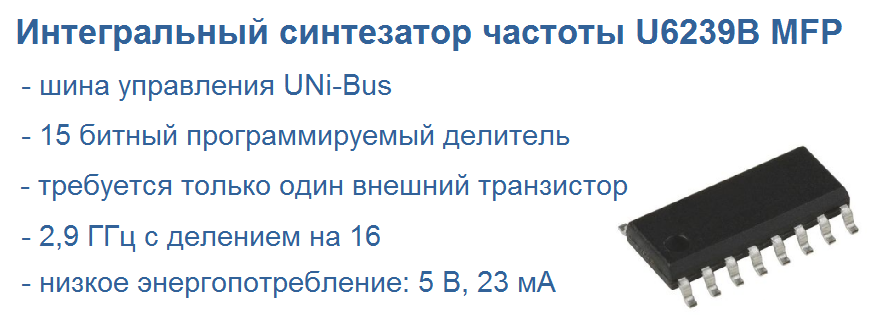 U6239B MFP – это однокристальный синтезатор частоты с двунаправленным управлением по шине I2C и однонаправленным управлением по 3-проводной шине, разработанный для спутниковых и кабельных ТВ-тюнеров. Эта микросхема содержит встроенный предусилитель, предварительный высокочастотный делитель, делитель опорной частоты с несколькими программируемыми коэффициентами деления, кварцевый генератор, фазо-частотный детектор вместе с зарядовым насосом, настраиваемый усилитель и аналого-цифровой преобразователь.