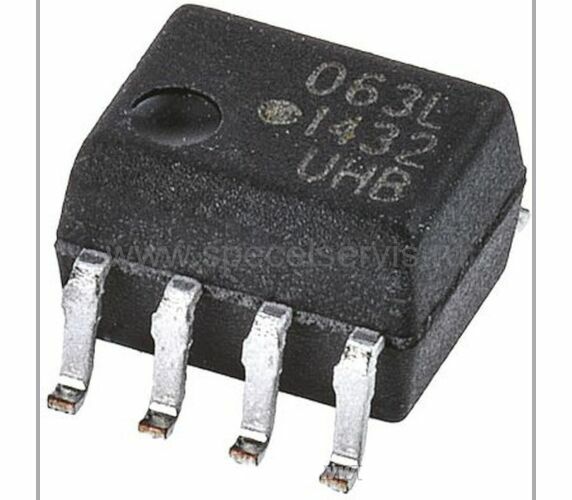 HCPL-063L-500E – высокоскоростная оптопара (оптрон) с логическими выходами, со скоростью передачи данных 15 Мб/с и оснащенная корпусом SOIC-8. Оптроны состоят из инфракрасного светодиода на входе, и фоточувствительного n-p-n-транзистора на выходе. Друг от друга модели этого семейства отличаются коэффициентом передачи по току и среднеквадратичным напряжением изоляции (RMS), которое равно 3,75 кВ. Оптопары предназначены для передачи сигналов между цепями с различными импедансами и применяются в приборах для обнаружения сети переменного тока, в герконовых реле, переключателях режима обратной связи цепей питания, схемах обнаружение вызова в телефонах, развязках по общему проводу и т.д.