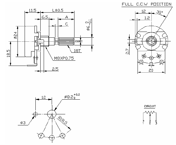 Переменные резисторы (потенциометры) серии R24N1 имеют угловое расположение контактов для навесного монтажа ручной пайкой при температуре до +300 °C. Точность номинального сопротивления составляет ±20 %. Они отличаются низкой ценой, способностью выдерживать 15 000 циклов вращения и малым шумом скольжения, менее 47 мВ.